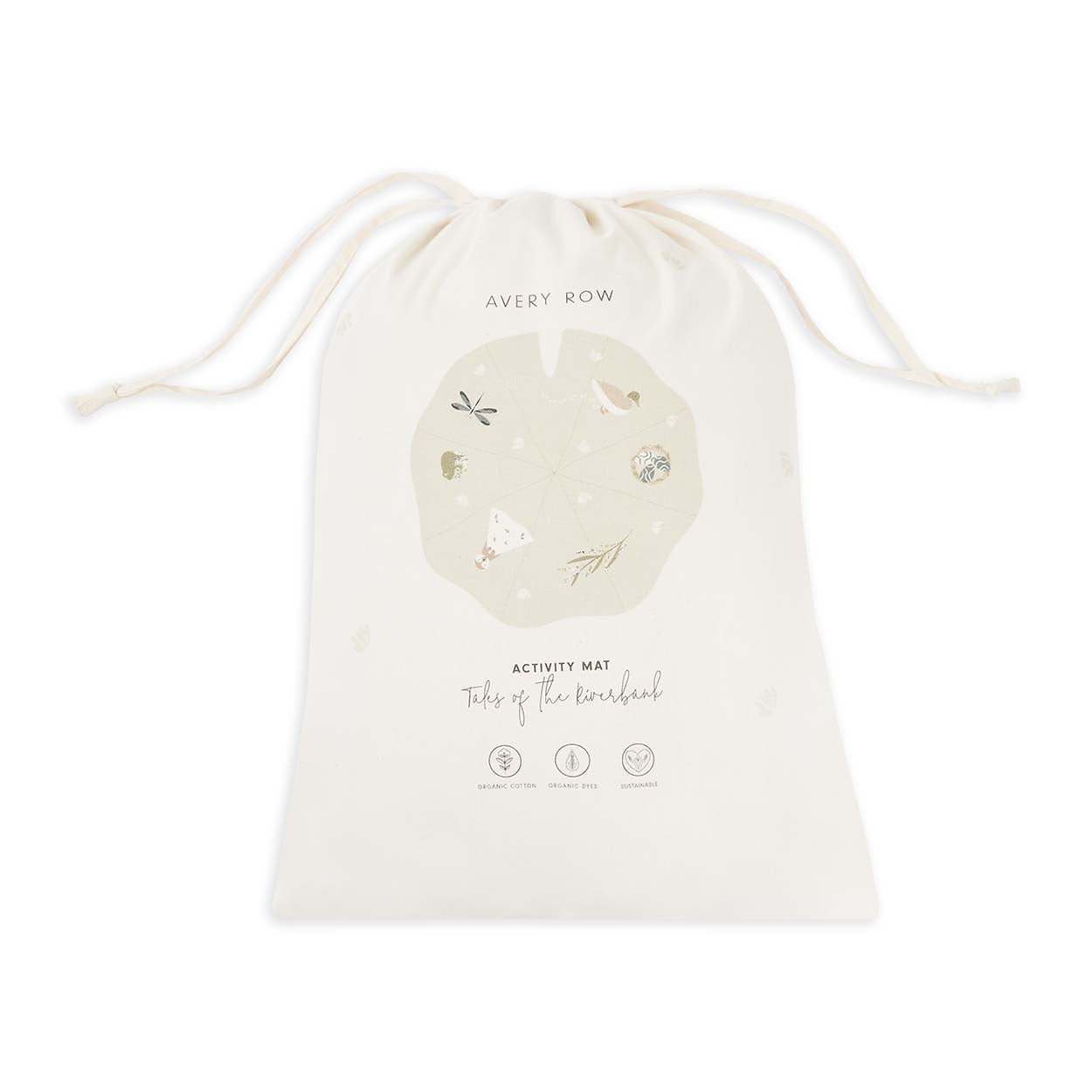 Our Lilypad shaped activity mat features all our favourite friends from the Riverbank Collection. With sensory elements such as a mirror, frog toy, crinkly leaves and a squeaky fluffy duck, this activity mat is designed with playing at home in mind. Made from 100% organic cotton and recycled polyester filling, this mat will entertain your little ones and fit perfectly into your home. Comes with a drawstring canvas bag for easy storage.